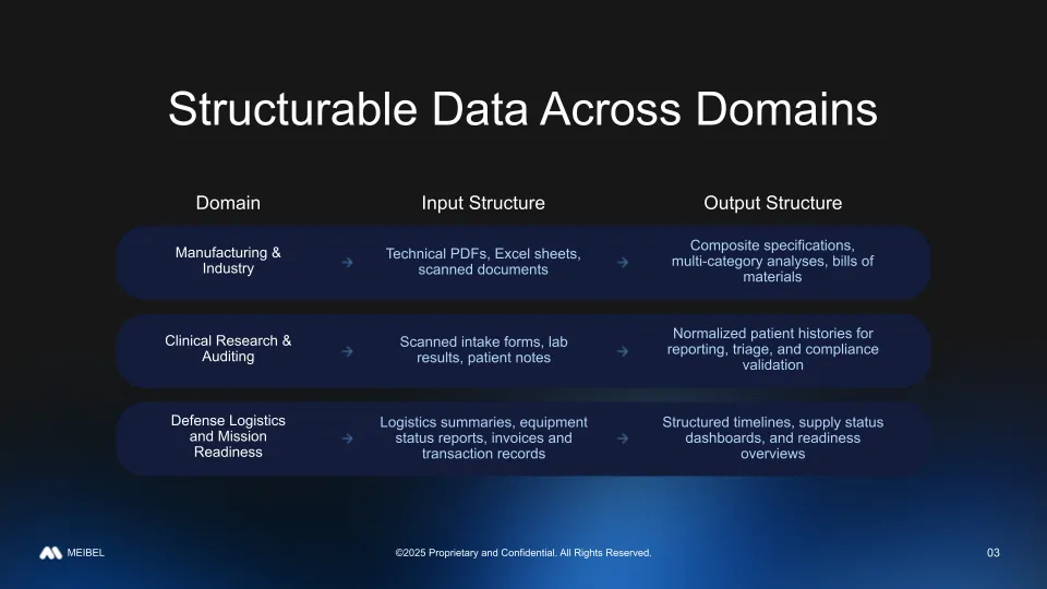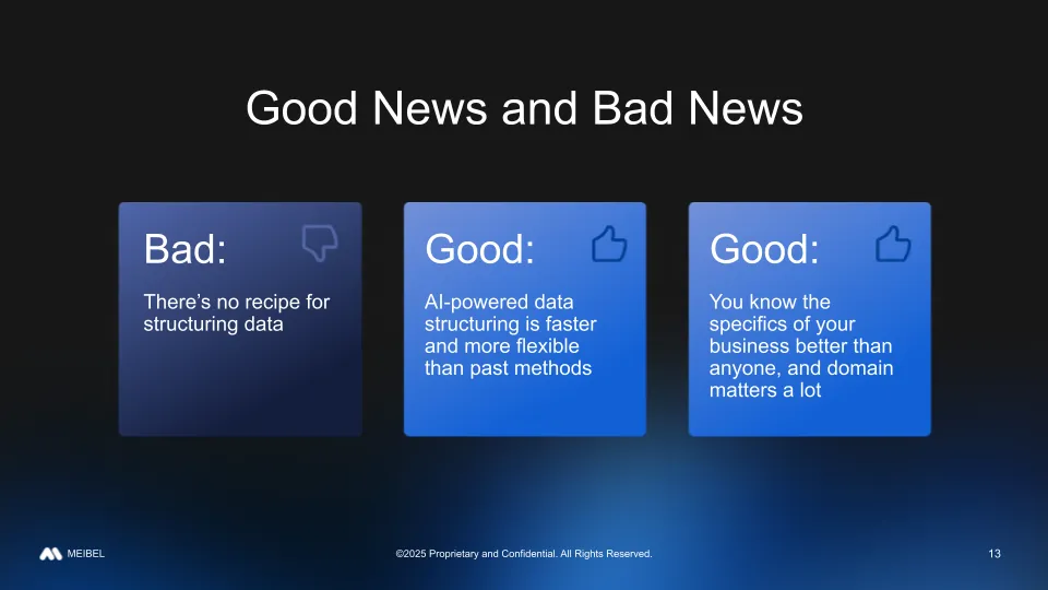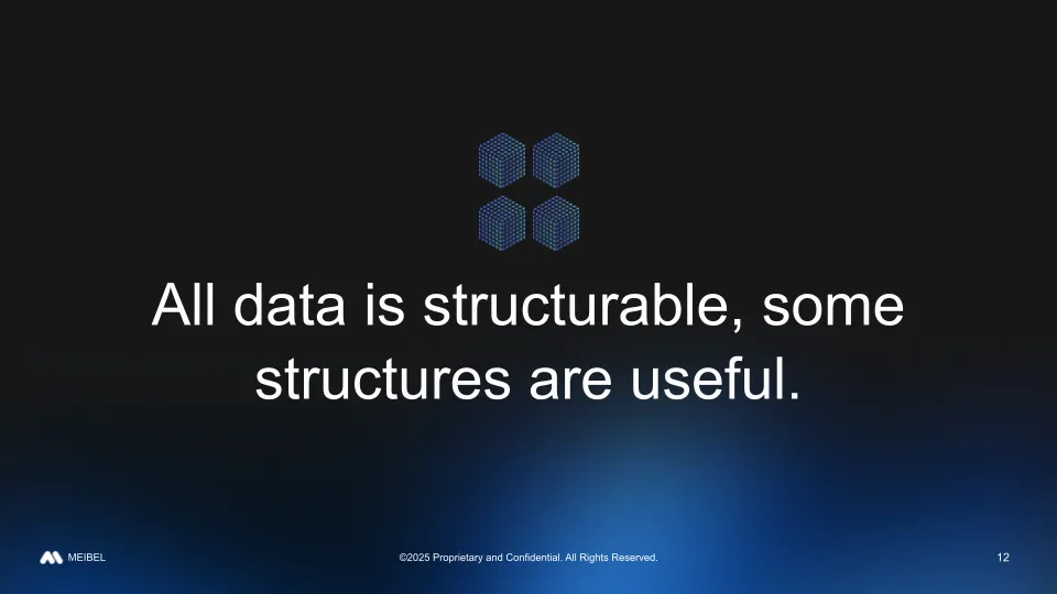 When working with modern AI techniques, understanding and working with the value of data goes beyond traditional measures. Just as important as what structures your data has and what structures you need it to have, is what structures your data can be transformed into. Here at Meibel, we've come up with a term for this: Structurable Data.