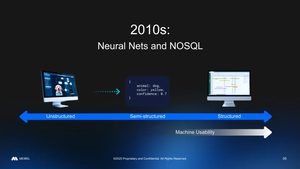 The 1990s and 2000s was a world of relational databases and tabular data. SQL was gaining a lot of popularity, Microsoft Excel was becoming a household name, and Microsoft Access and similar tools were trying to span the world between those tools. But with the tooling requiring highly structured data to operate, the threshold for machine usability was quite high. Similarly, in order to get your data into that level of structure, the options were relatively limited. It had to be either manually structured and restructured, or you had rigid data pipelines and software methods to bring a certain input into a certain output.