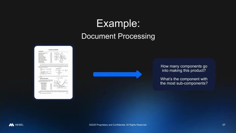 Consider a document processing example where we have some technical report documents and we want to get to certain answers about our manufacturing process based on those documents such as: