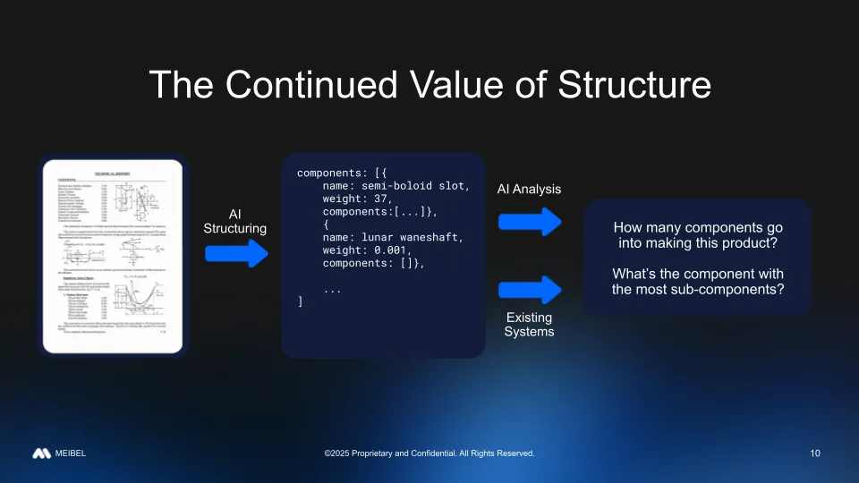A second major benefit to working with structurable data in this way is that you retain access to a lot of the value of your existing systems. All of your existing analysis pipelines are built to work with a certain structure of data. If you choose to move into that structure, perhaps in addition to other structures, you get all the value of the prior established structure going forward. That's not just business value or value in terms of engineering time saved to not have to rebuild a certain process; it also means that if you're in a regulated or restricted industry, you can have confidence that everything that has been approved, vetted, and verified downstream of that structure is working as intended and now the AI structuring piece can be the focus of your review and validation.