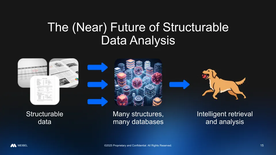 The near future of AI analysis brings together multiple data sources housing useful structural forms with intelligent retrieval and analysis that selects the right structure for each problem. This moves the search away from a one-size-fits-all solution, and instead toward a dynamic system that uses the structurability of data flexibly. That’s what we’re building at Meibel.