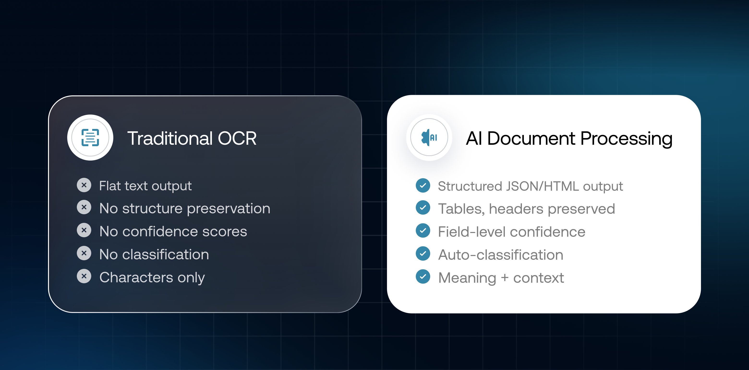 This distinction matters because many enterprise teams still think of document processing as "better OCR." It is not.